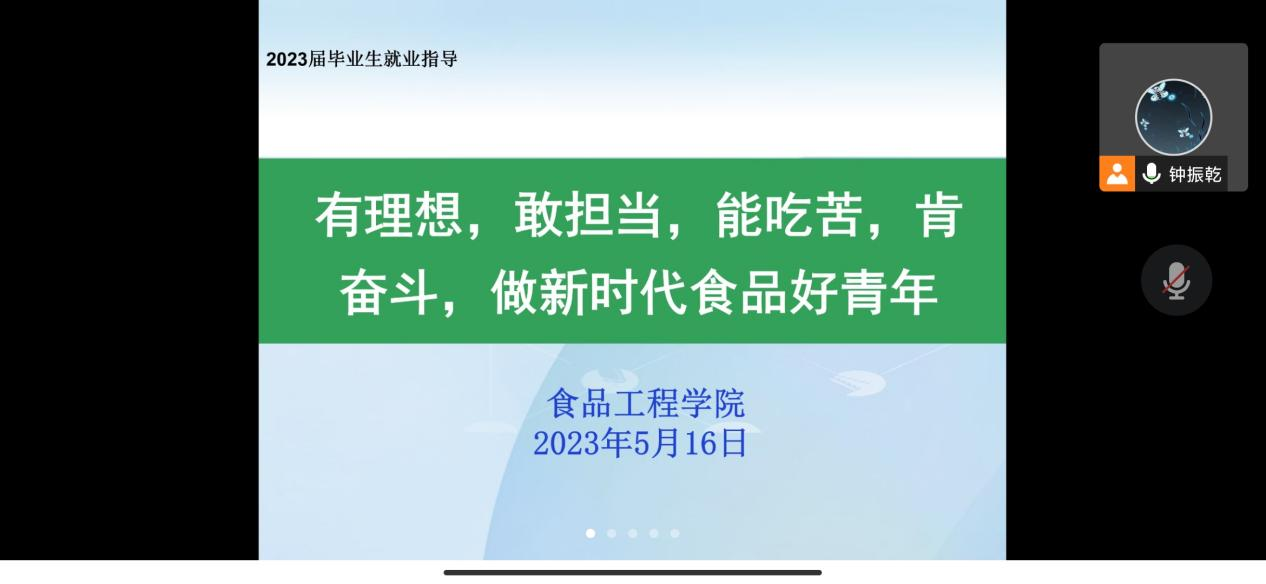 为进一步学习贯彻党的二十大精神,教育同学们坚定不移听党话、跟党走,树立正确的就业观和职业观,立志做有理想、敢担当、能吃苦、肯奋斗的新时代好青年,2023年5月16日下午学院通过线上开展“有理想,敢担当,能吃苦,肯奋斗,肯奋斗的新时代食品好青年”主题毕业生就业指导。会议由学院党委副书记钟振乾老师主持,毕业班全体同学参加。
