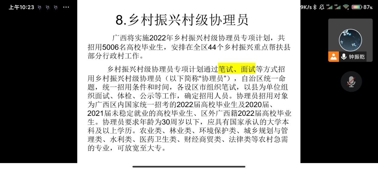 会上,钟老师首先通报了学院目前各班就业情况及学校就业情况,并着生分析了学校2022届毕业生去向落实情况,通过详实的数据,教育引导同学们要认清形势,形成合理的预期,找准定位。钟老师还推介了“三支一扶”、“党建工作组织员”、“乡村振兴村级协理员”等基层项目,鼓励同学们找工作不要怕吃苦、不怕累,抓住机遇,在基层工作中去锻炼自己,实现自我的价值和挖掘自我的潜力。