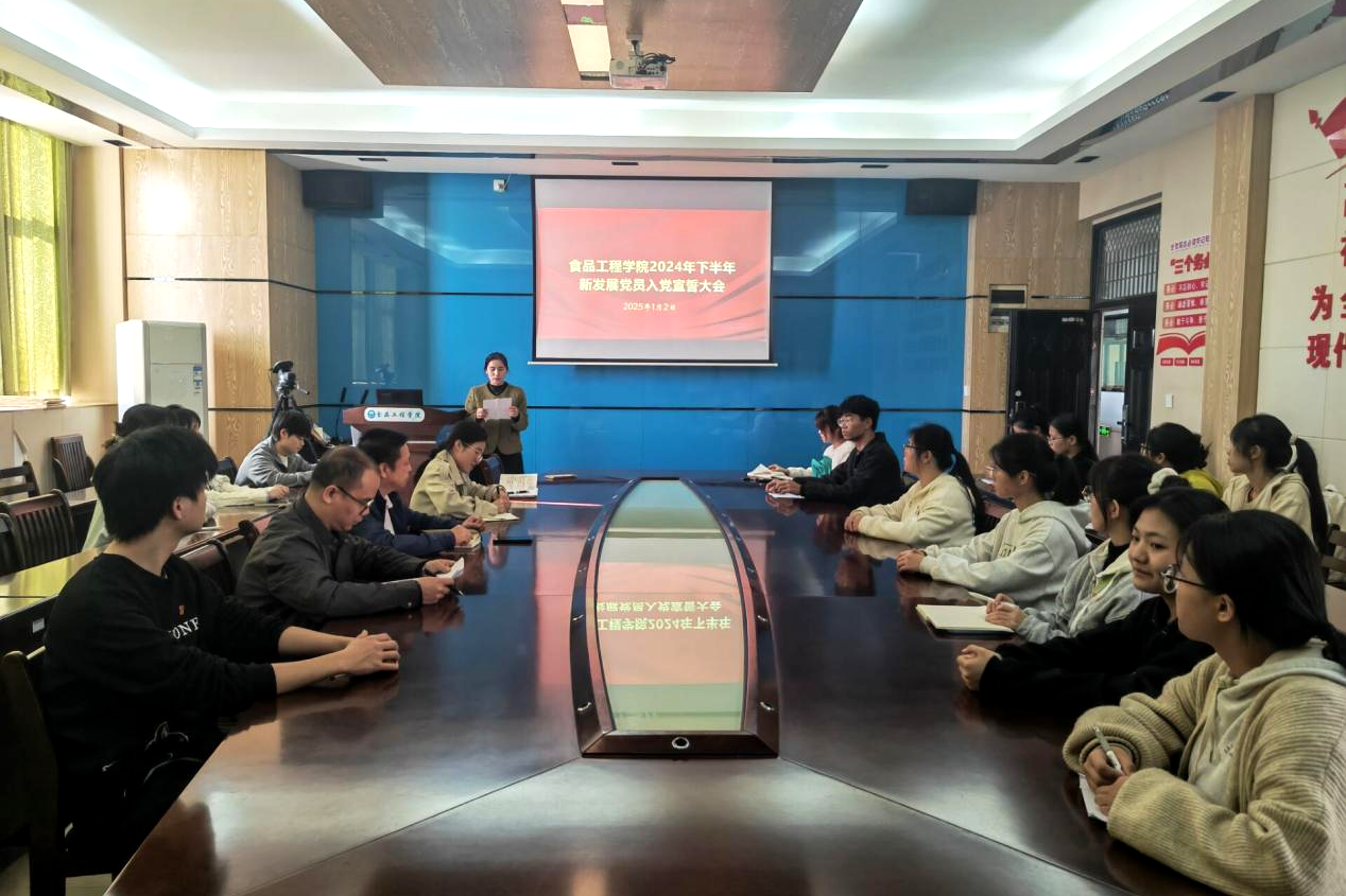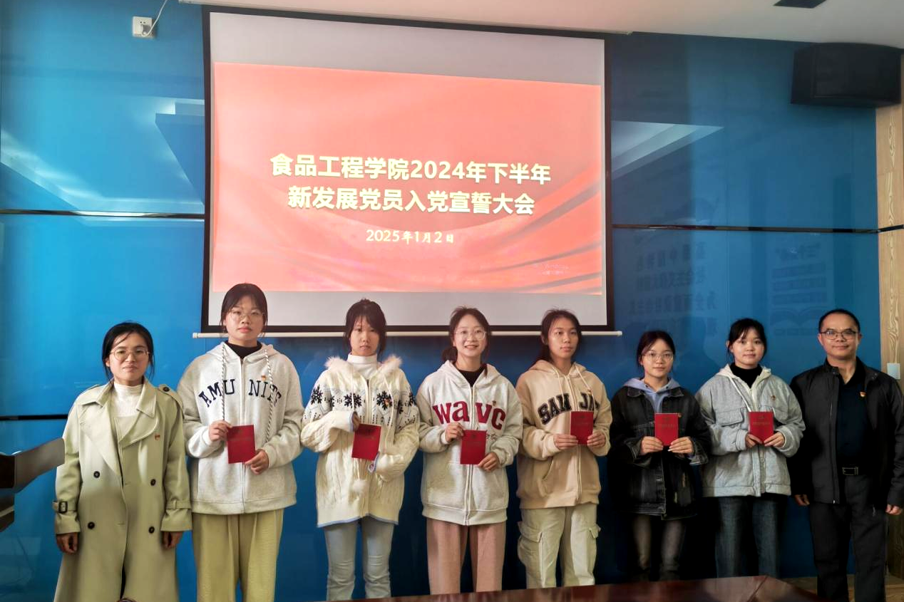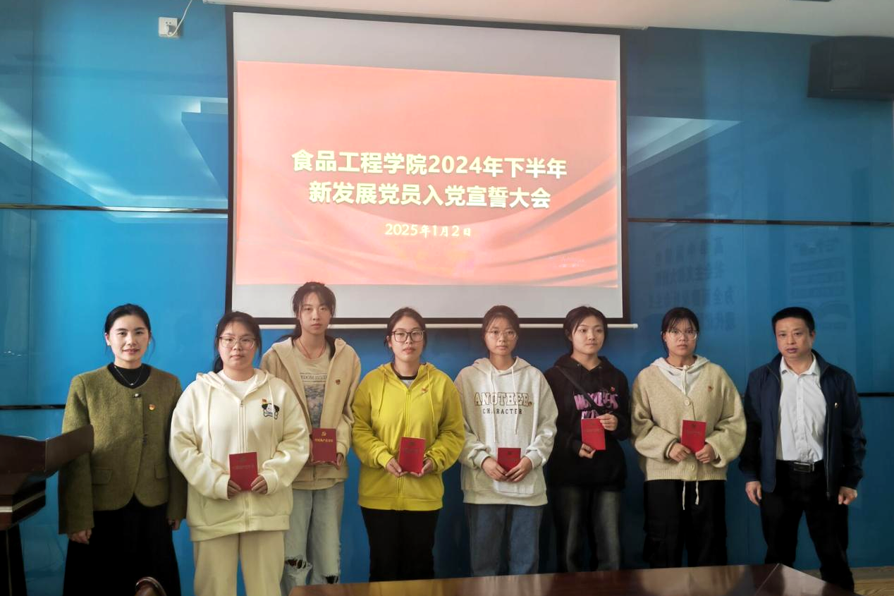 为落实新时代党的建设总要求,进一步提升党员的党性修养,2025年1月2日,食品工程学院举行2024年秋季学期预备党员入党宣誓仪式。学院党委李贤阳书记、钟振乾副书记,各学生支部书记、党员代表、2024年秋季学期新发展党员参加会议,会议由程莹老师主持。