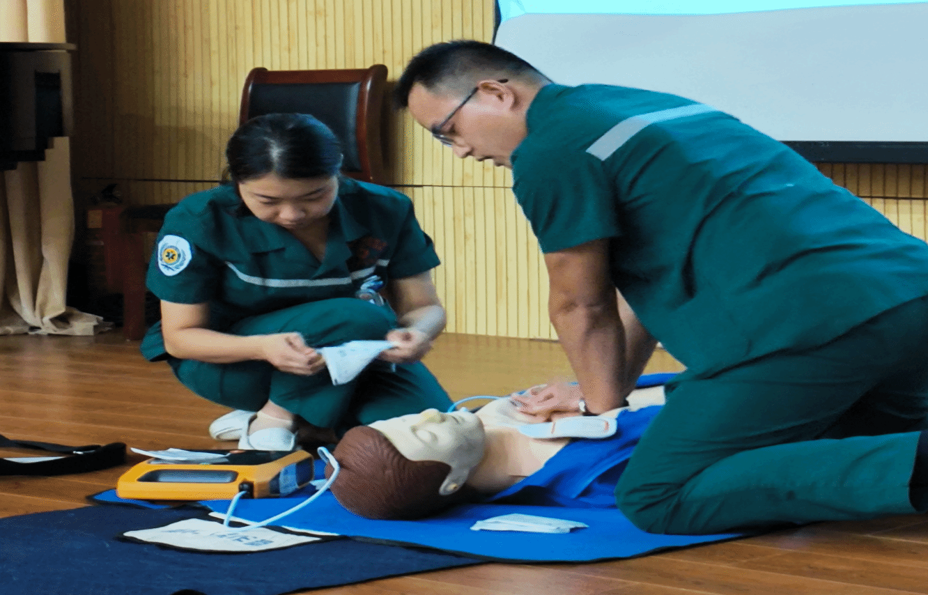 用通俗易懂的语言讲授了心肺复苏和海姆立克法操作要点,随后进行了应急救护的实际演练。刘辉德护长提出,要加强对常见急症以及意外伤害等突发事件的认识以及相关技能的培养,同时增强社会对急救技能的重视。在心肺复苏模拟展示环节,刘护长与同行医护人员利用专业的技术和娴熟的手法演示了成功救护的过程,迎来全场掌声。