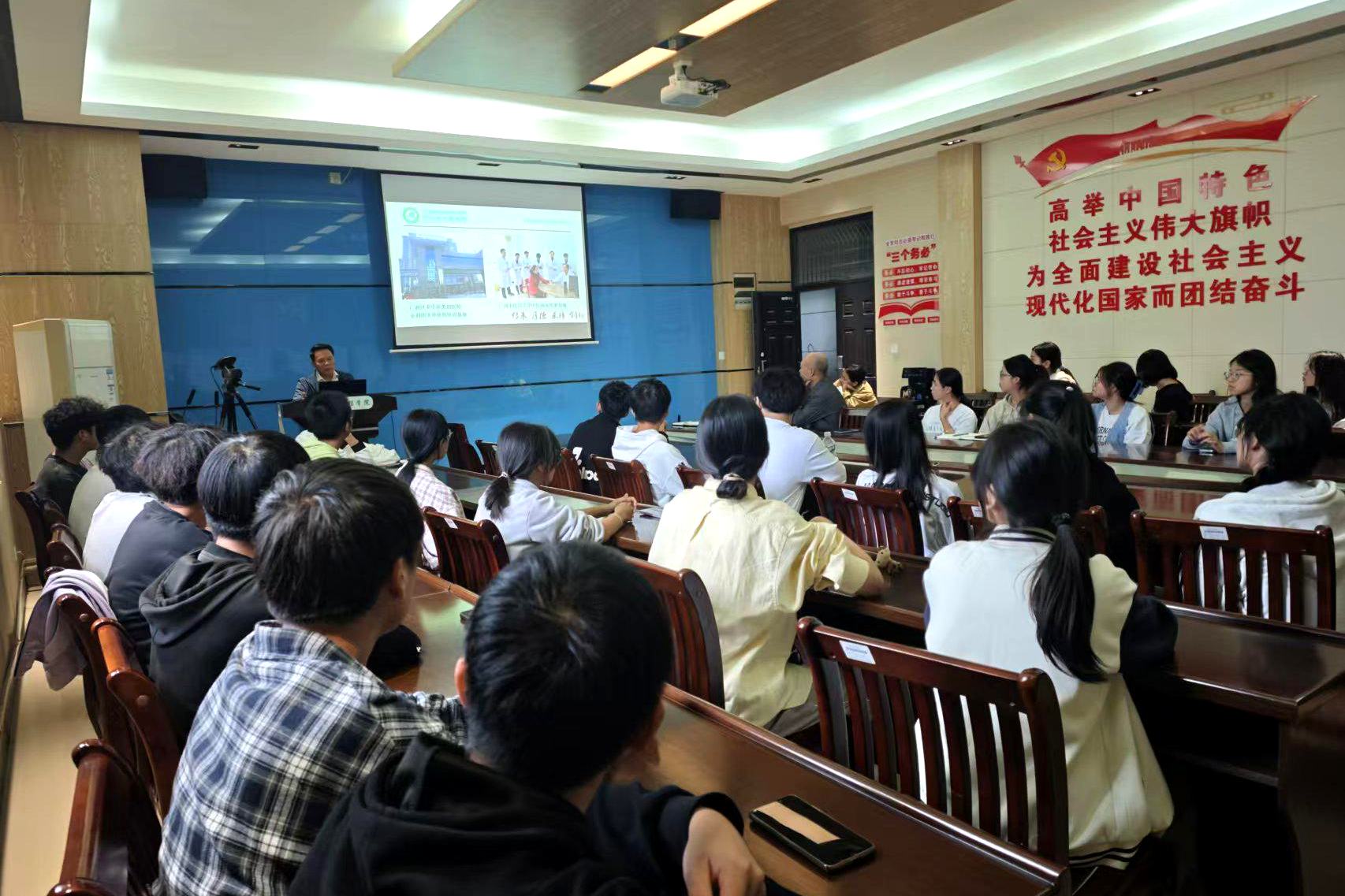 会议伊始,朱主任介绍了钦州市中医医院的历史和在中医药领域的成就,帮助学生们建立膳食健康和营养学的基础知识。他引入了“膳食”与“营养”的概念,探讨了膳食营养对健康的重要性,强调合理的膳食结构不仅能提供身体所需能量与营养,还能预防心血管疾病、糖尿病及肥胖等慢性疾病。这一部分内容拓宽了学生们对膳食在健康管理中的理解,为他们的专业学习奠定了理论基础。在药膳的研发和推广环节,朱主任详细介绍了药膳的定义、分类及其独特作用,阐释了药膳在治疗与健康维护中的双重角色。他还分享了药膳的研发过程,包括药材选择、药食配比和烹饪方法的应用,帮助学生们理解药膳的科学基础,为有意从事药食同源食品开发的学生提供了实用指导。