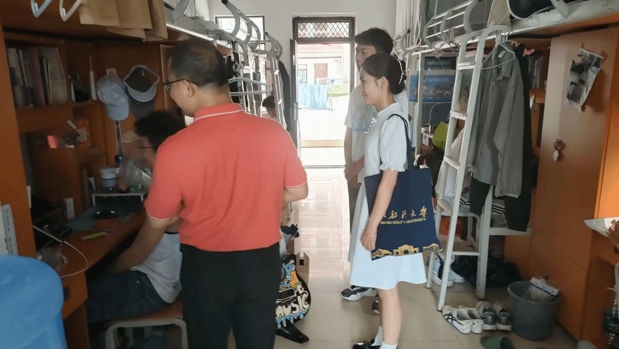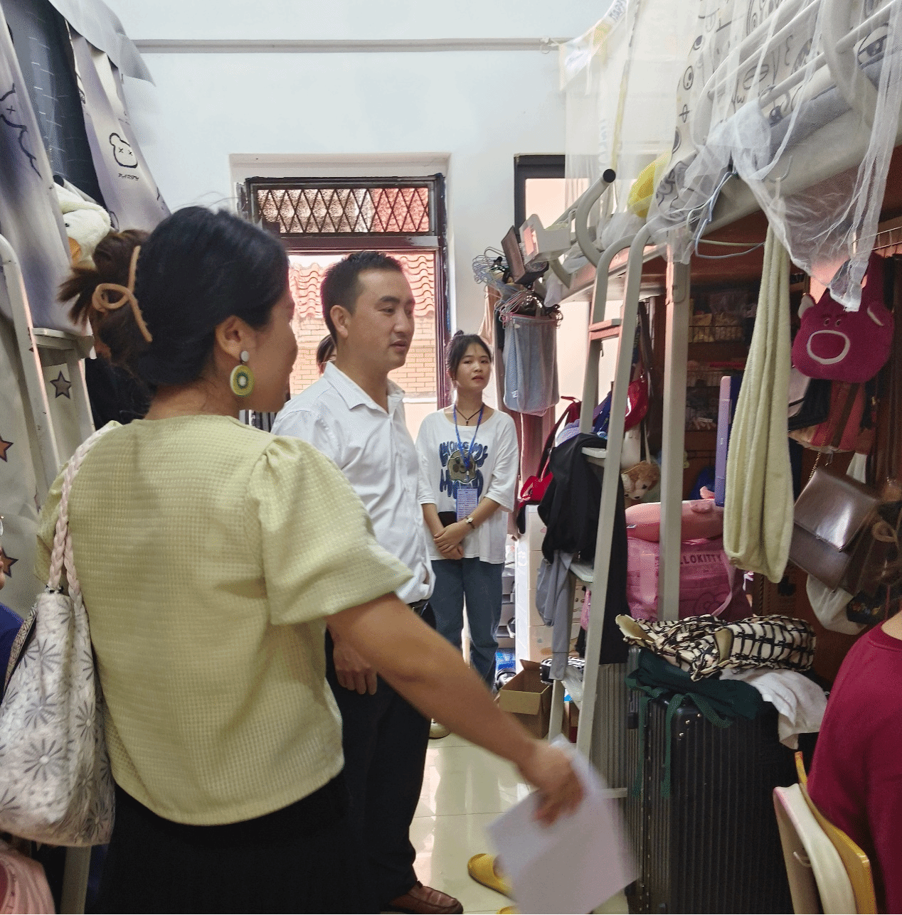 为深入了解同学们返校情况及返校后的思想、生活和学习情况,2023年9月4日下午,在学院党委书记陈东升老师带领下,学院党委副书记钟振乾老师、22级辅导员杨国玲老师、23级辅导员程莹老师与团委、学生会学生干部分成两队深入我院学生宿舍进行走访慰问。