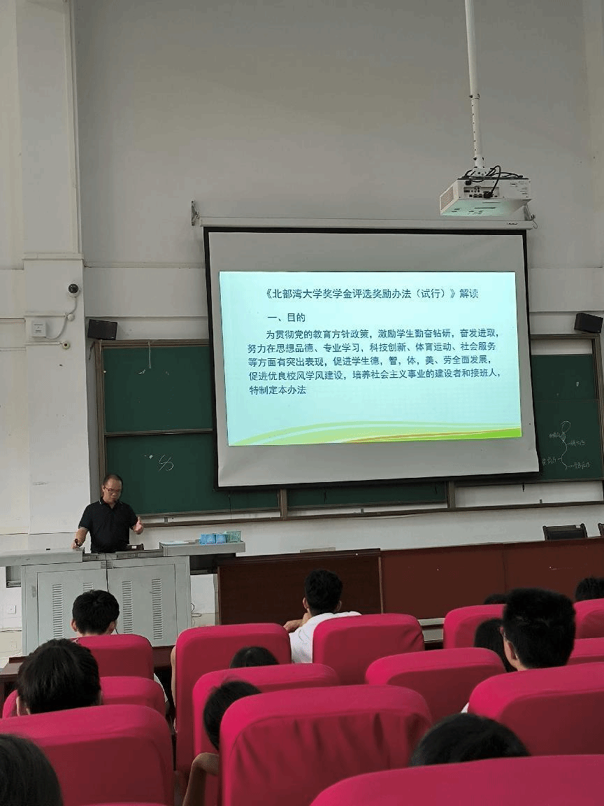 会上,学院党委副书记钟振乾带领新生们学习《北部湾大学学生综合素质测评方法》、《北部湾大学奖学金奖励办法(试行)》等文件。钟老师从学习文件的原因、目的讲起,分析了“学生综合素质测评办法”的作用和意义,并逐条进行解读,鼓励同学们通过积极参加各项学习活动、学科竞赛、社会实践,创造机会磨练本领,提高自身综合素质。钟老师还列举了学院最近三年考研、学科竞赛情况,勉励同学们向优秀学习。最后,钟老师祝愿同学们早日成为优秀的应用型人才,为国家发展、民族振兴做贡献。