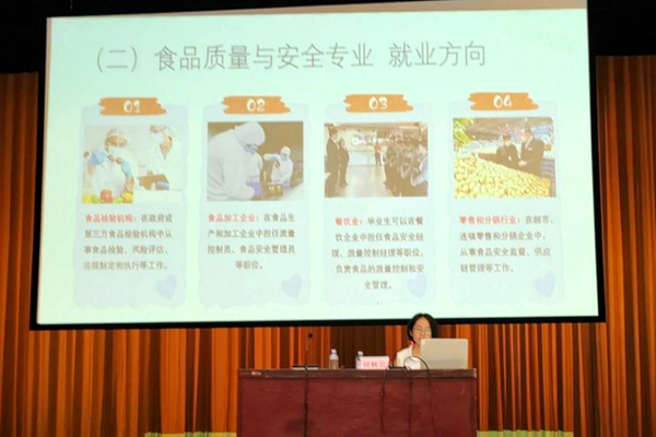 随后,何秋云科长在讲座中深刻阐述了食品专业在现代社会中的重要地位,特别是食品检验在保障食品安全、推动可持续发展等方面所扮演的关键角色。她分别从食品科学的基础知识、行业发展现状、职业前景及技能要求等多个维度进行了深入细致的分享,为学生们提供了全面的行业洞察。