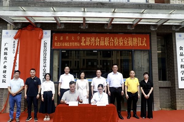 7月10日,学校与钦州市钦北区市场监督局共建北部湾食品联合检验室签约暨揭牌仪式顺利举行。我校党委常委、副校长陈丹、钦州市钦北区人民政府副区长黄如龙、钦州市市场监督管理局副局长李剑春等领导以及13家企业代表出席揭牌仪式。揭牌仪式由食品工程学院院长戴梓茹主持。
