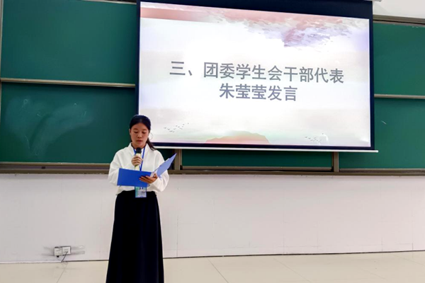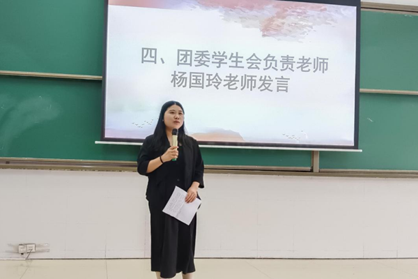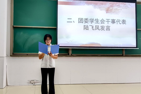 团委书记杨国玲老师发言,她肯定了团委学生会的过去一段时间工作成效,并明确了今后的工作方向,杨老师从“服务、协作、成长”对团委学生会成员提出要求与希望。钟振乾老师从“自我管理、自我服务、自我教育、自我提高”谈起,要求团委学生会成员要强化理想信念,加强学习,努力提高,快速成长。强调团委学生会要在校园文化、志愿服务、社会实践等充分发挥桥梁纽带作用,服务好师生,勉励同学们要平衡学习与工作,锤炼品格、勇于创新,争做新时代优秀青年。