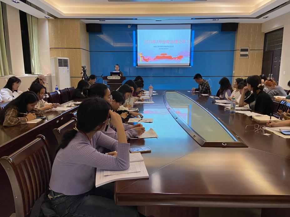 食品工程学院低年级学生党支部于2023年3月20日在7A-429召开3月份政治理论学习会议,会议分成三个阶段来学习,包括学习习近平总书记对深入开展学雷锋活动重要指示精神强调、学习中国共产党第二十届中央委员会第二次全体会议精神、学习2023年政府工作报告,由此来开展政治理论学习。