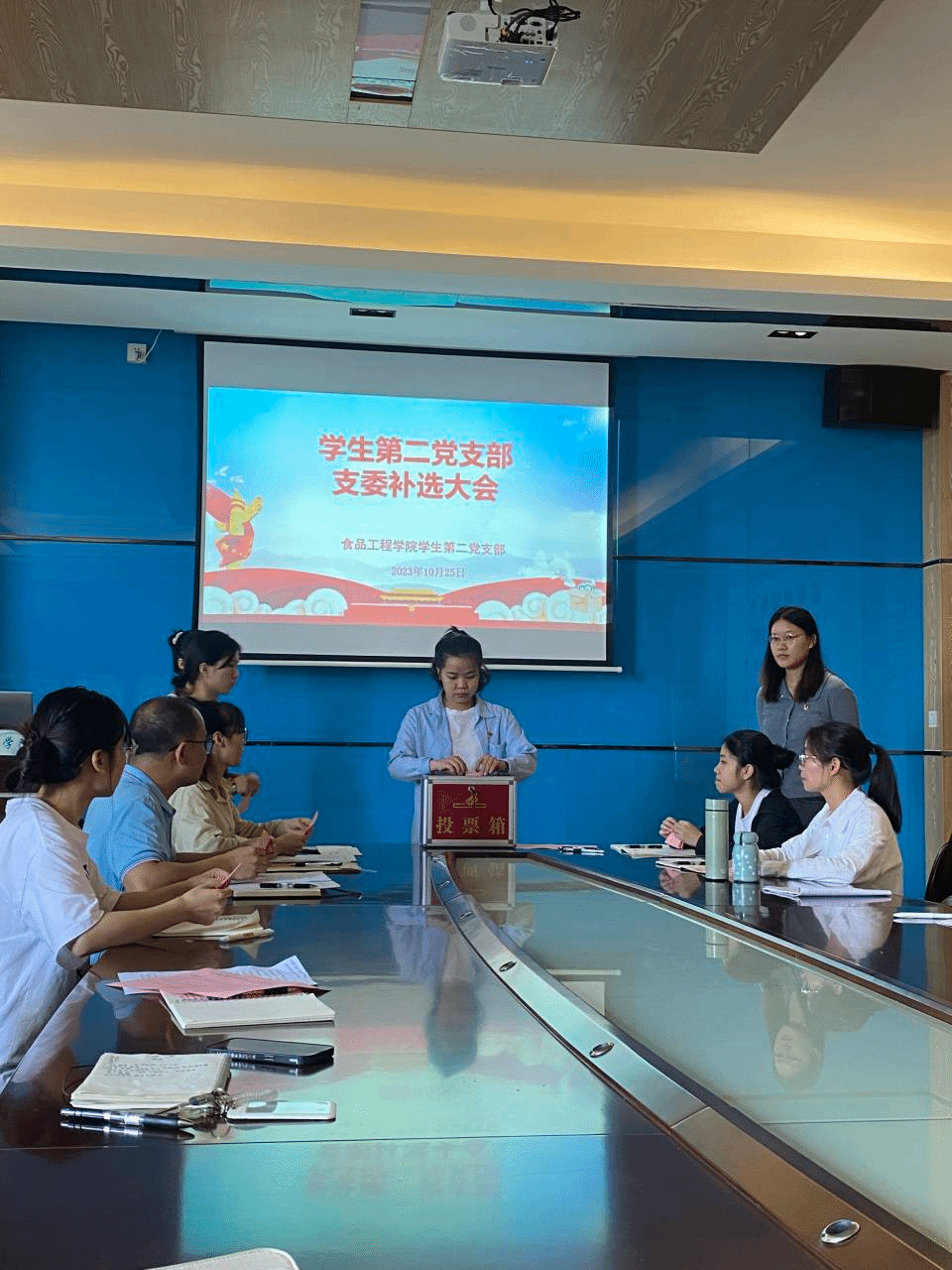 为使支部工作平稳、持续、顺利进行,2023年10月25日,食品工程学院学生第二党支部在7A-429会议室召开支部支委补选大会,全体党员同志参加会议,本次会议由学院委副书记兼学生第二党支部书记钟振乾主持。